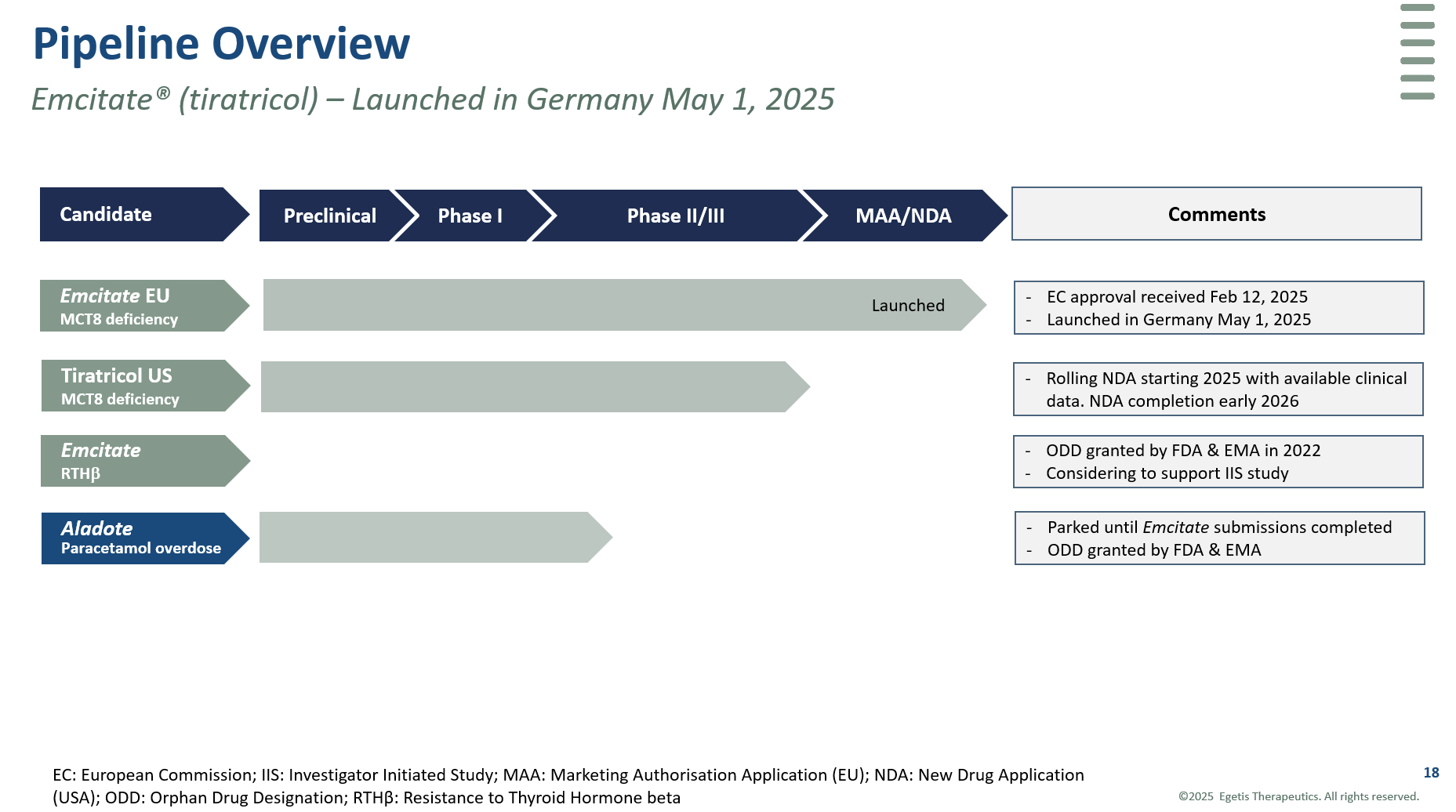 Emcitate holds Orphan Drug Designation (ODD) for MCT8 deficiency and resistance to thyroid hormone type beta (RTH- β) in the US and the EU. Emcitate has been granted Rare Pediatric Disease Designation (RPD) which gives Egetis the opportunity to receive a Priority Review Voucher (PRV) in the US, after approval.